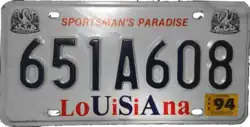 1993 – December 31, 2001 | Embossed dark blue serial on reflective white plate, with or without border line; "Louisiana" screened in red handwritten font centered at top | "SPORTSMAN'S PARADISE" screened in blue centered at bottom | ABC 123 | AAA 000 to approximately KLK 999 | Known as the "Lipstick" base. All 1974–93 plates were replaced with this design during 1995–96. |