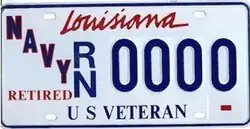 U.S. Veteran—Navy—Retired | "NAVY" printed diagonally and "RETIRED" printed horizontally to left of serial | 123 |