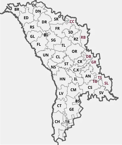 As a result of a small part of eastern Moldova not being under Moldovan control (Transnistria), plates with the codes CC, GR, RB, SL, TG and TS are rarely issued. Dubăsari district, using code DB, is partially controlled by Moldova with these plates being regularly issued.