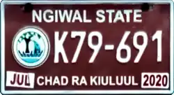 2020 (?) | Yellow serial on blue background; "Ngeremlengui State" and "Republic of Palau" in white at top and bottom respectively | Ngeremlengui | |||
