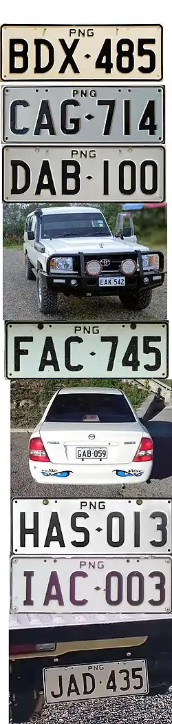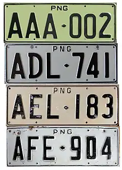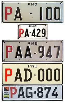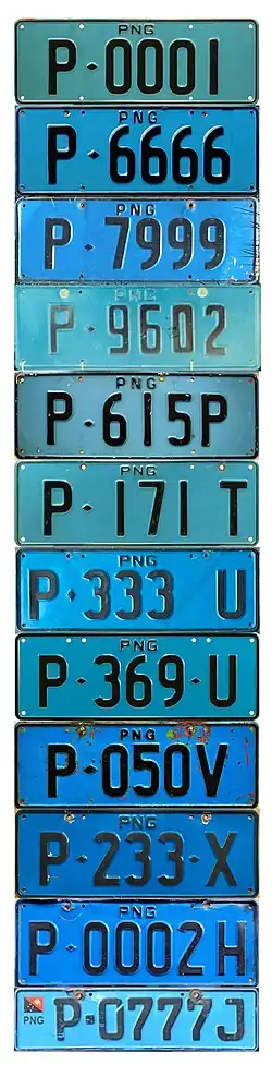 Altona: P-0000 to P-5999. None issued in the P-3000 to P-4999 range. Page: P-6000 to P-8999 Houn: P-9000 to P9620 at least. P-000M to P-999P; Page P-000Q to P-999T: Altona P-000U to P-349U; Licensys. One vertical diamond P-350-U to P-999-U; Licensys. Two Horizontal diamonds P-000V to P-999V; Page Industries. P-000-W to P-999-Z; Licensys. P-0000A onwards reaching P-0000L by 2023. From P-0000A to P-0999I, series ran with a lead zero (so after P-0999A is P-0000B). From P-0000J onwards serials rolled over to the likes of P-1000J after P-0999J etc. Vertical diamonds commence at P-7000K. Euro Flag style plates P-0800E in 2009 to P-0999E, P-0900G to P-0999G, P4500-I to P4899-I, P-0450J to P-0639J, P-0700J to P-0999J, P-5000J to P-5599J, P-6100J to P-6299J, P-6500J to P-6799J, P-0100K to P-0199K, P-0650K to P-0659K, P-3450K to P-3499K, P-6170K to P-6179K, P-9000K to P-9699K. L Batches are made based on numbers allocated by MVIL in Port Moresby. As a result, batch runs can be small and sporadic. Some plate numbers made by Licensys are remade in the flag style on request as replacement plates. Note that I suffix plates have the square separator just before the last letter (P4500-I instead of P-4500I). |