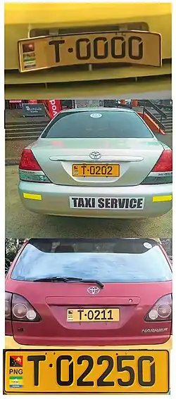 Taxi registration plates in the Euro Flag style, issued by Morobe Land Transport. These commenced at T-0000 to about T-0359. These were followed by T-02250 onwards. At least five sets of plates (T-0210 to T-0214) were erroneously made using the letter O instead of the number 0 (zero). |