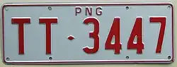 | Registration plate used on motorcycles belonging to the Administration of the Territory of Papua New Guinea. | ![]() |