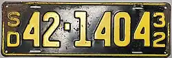 1932 | Embossed yellow on black with border line; vertical "SD" and "32" at left and right respectively | none | 1-1234 10-1234 |