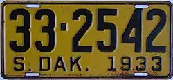 1933 | Embossed black on yellow with border line; "S. DAK. 1933" at bottom | none | 1-1234 10-1234 |
