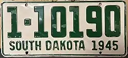 1945 | Embossed green on white with border line; "SOUTH DAKOTA 1945" at bottom | none | 1-1234 10-1234 |