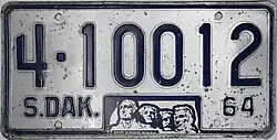 1964 | Embossed dark blue on reflective white with border line; "S.DAK.", stamped Mount Rushmore graphic and "64" at bottom | none | 1-12345 10-1234 |