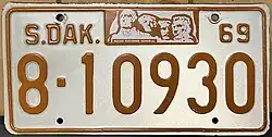 1969 | Embossed orange on reflective white with border line; "S.DAK.", stamped Mount Rushmore graphic and "69" at top | none | 1-12345 10-1234 |