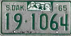 1965 | Embossed green on reflective white with border line; "S.DAK.", stamped Mount Rushmore graphic and "65" at top | none | 1-12345 10-1234 |