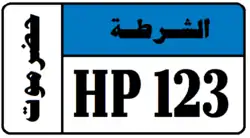 Unlike the aforementioned governorates, Taiz Governorate has not replaced the previous and other existing registration plates with a uniform new format like the rest of southern Yemen but uses the Mandatory typeface for numerals and Square Kufic for Arabic text since 2018.[1] Taiz Governorate traffic police have introduced two classes of "Temporary" License plates for vehicles missing a license plate. It is unclear how long such temporary plates will remain in circulation and what format will replace them, but they are de facto the current license plate format issued by the governorate.[8] Taiz temporary license plates have a top row that states "ج - ي" (J.Y.), standing for "Republic" and "Yemen" in Arabic. There is also the text "مؤقت - تعز", meaning "Temporary" and "Taiz", the name of the governorate.