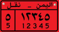 Vehicle registration plates of Yemen entered regular usage in 1993. The current version started in 2018 used FE-Schrift typeface for alphanumeric and Square Kufic typeface for Arabic text.[1]