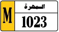 Al Mahrah Governorate License Plates consist of black text and black boundary on white background. Hadramaout Governorate plates consist of the governorate name in Arabic (المهرة) and a 4 digit number. Al-Mahrah Governorate plates also have a strip on the left hand side with the letter M in black on a background whose color depends on the classification of the vehicle. Similar to Hadramout, The license plates for Al-Mahrah use a unique serif font.[5]