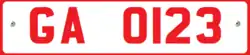The number plates in this series started with GA. They had 4 digits. Private vehicle plates were White on Black background. Commercial plates were red on white background. However, commercial plates had their color change in 1978, and were then issued in black on yellow.