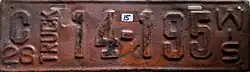 | Truck | Embossed black serial on orange plate; vertical "WIS" at right, weight class over "28" at left; vertical "TRUCK" between year and serial | A 12-345 | Coded by weight class | Weight classes were A, B, C, D, E, and F |