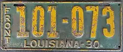 Louisiana | Green base with embossed yellow block lettering and border. "FRONT" and "REAR" embossed at left. | "none" | 123-456 | Different front and rear plates as noted. | |