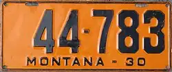 Montana | Embossed black lettering and rims on orange base. "MONTANA 1930" at bottom. | "none" | 12-345 | ||