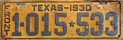 Texas | Embossed black lettering and rims on yellow base. "TEXAS – 1933" at top. Star separator at center. | 123-456 1-234-567 |