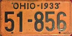 Ohio | Embossed black numbers on orange plate; "OHIO 1933" embossed in at top. | none | A·12345 AB·1234 12345·A 1234·AB A·1234·B |
