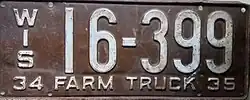 Farm | Embossed white serial on brown plate with border line; "34 FARM TRUCK 35" at bottom, vertical "WIS" at left | 12-345 | 1 to approximately 50-000 | First year for farm license plates | |