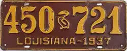 Louisiana | Embossed golden yellow serial with pelican separator on maroon plate with border line; "LOUISIANA–1937" centered at bottom | none | 123-456 | Issued in blocks by horsepower class and branch office | |