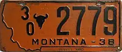 Montana | Embossed black numbers on orange plate with state-shaped border; embossed black buffalo skull used as separator; "MONTANA–38" embossed in black block letters below numbers | none | 1-12345 1/0-1234 |