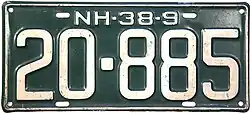 New Hampshire | Embossed white lettering and rims on dark green base. "NH 38-9" at top. | ||||