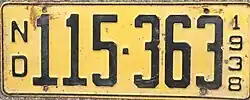 Oklahoma | Embossed black lettering on yellow base. "OKLAHOMA – 1938" at top. | none | 123–456 | unknown | |