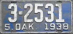 South Dakota | Embossed white letters and rims on blue base. "S. DAK. 1938" at bottom. | none | 1–2345 12-3456 |