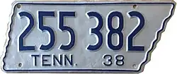 Tennessee | Embossed blue lettering and rims on state-shaped plate. "TENN. 38" at bottom center. | none | 1–2345 1A-2345 |