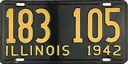 Illinois | Embossed golden yellow lettering on black base plate. "ILLINOIS 1942" embossed at bottom. | none | 123 456 | unknown | |