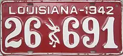 Louisiana | Embossed white lettering and rims on red base. Pelican logo separator embossed near center. | none | 12-345 123–456 |