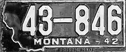 Montana | Embossed white numbers on black plate with state-shaped border; "MONTANA–42" embossed in white block letters below numbers | none | 1-12345 10-1234 |