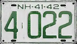 New Hampshire | Embossed green lettering and rims on white base. | Embossed forest green numbers on white plate with border line. | |||