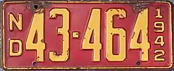 North Dakota | Embossed yellow lettering and rims on red plate. "ND" embossed vertically to left and "1942" vertically at right. | none | 12-345 123–456 |