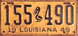 Louisiana | Embossed black serial with pelican separator on yellow plate with border line; "19 LOUISIANA 49" at bottom | none | 12 345 123 456 |