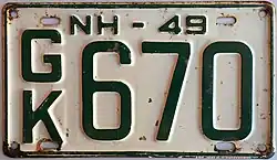 New Hampshire | Embossed forest green numbers on white plate with border line; "NH 49" embossed in wide forest green block letters at top. | AB123 | County-coded (AB). | ||