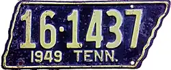 Tennessee | Embossed yellow lettering and rims on black base. "1949 TENN." embossed at bottom center. | none | 12-1234 | County-coded registration. | |