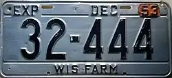 Farm | Embossed black serial on bare aluminum plate; "EXP" at top left, "DEC 52" at top right; "WIS FARM" at bottom | 12-345 | 1 to approximately 90-000 | Revalidated for 1953 with black on orange tabs | |