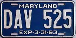 Maryland | Embossed white numbers on blue plate with border line; "MARYLAND" and "EXP-3-31-63" embossed in white block letters centered at top and bottom respectively | None | ABC 123 | ||