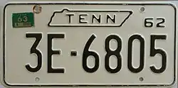 Tennessee | Embossed black numbers on white plate with border line; "TENN" embossed in black block letters centered at top, surrounded by state outline; "62" embossed in top right corner | None | 1-1234 1A-1234 1AB-123 10-1234 10-A123 10-AB12 |