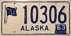 Alaska | Embossed blue numbers on white plate with border line; embossed state flag at left; "ALASKA" embossed in blue block letters centered at bottom; "62" embossed in bottom right corner | None | 12345 A1234 |