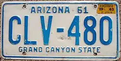 Arizona | Embossed blue numbers on white plate with border line; "ARIZONA 61" embossed in blue block letters centered at top | "GRAND CANYON STATE" embossed in blue block letters centered at bottom | ABC-123 | CAA-001 to approximately DMC-999 | 1961 base revalidated for 1963 with stickers |