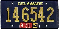 Delaware | Golden yellow registration lettering riveted onto navy base. State name decal attached at top. | ||||