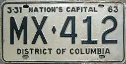 District of Columbia | Embossed dark green numbers on reflective white plate with border line; "DISTRICT OF COLUMBIA" embossed in dark green block letters centered at bottom; "3-31" embossed in top left corner and "63" in top right corner | "NATION'S CAPITAL" embossed in dark green block letters centered at top | AB♦123 | AA♦100 to approximately WV♦999 | |