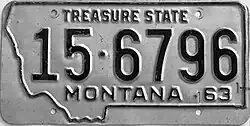 Montana | Embossed black numbers on unpainted aluminum plate with state-shaped border; "MONTANA" embossed in wide black block letters centered below numbers; embossed "63" to right of state name | "TREASURE STATE" embossed in narrow black block letters centered above numbers | 1·12345 10·1234 |