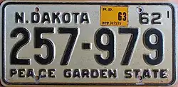 North Dakota | Embossed black numbers on yellow plate with border line; "N.DAKOTA" embossed in black block letters in top left corner; "62" embossed in top right corner | "PEACE GARDEN STATE" embossed in black block letters at bottom | 123-456 | 1 to approximately 355-000 | 1962 base plate revalidated for 1963 with yellow stickers |