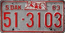 South Dakota | Red embossed lettering and rims on white with stamped Mount Rushmore graphic at top | None | 1-12345 10-1234 |