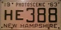 New Hampshire | Embossed forest green numbers on white plate; "NEW HAMPSHIRE" embossed in wide forest green block letters at bottom; "19" embossed in top left corner and "63" in top right corner | "PHOTOSCENIC" embossed in narrow forest green block letters centered at top | AB123 | County-coded | |
