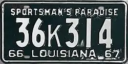 | Louisiana | Embossed white serial on dark green plate with border line; "66 LOUISIANA 67" at bottom | "SPORTSMAN'S PARADISE" at top | 123A456 | Letter corresponds to State Police troop area of issue | ||