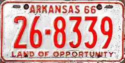 Arkansas | Embossed red serial on reflective white plate with border line; "ARKANSAS 66" centered at top | "LAND OF OPPORTUNITY" at bottom | 1-123456 10-12345 |
